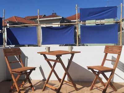 O nosso apartamento situa-se em Vila Nova de Gaia, no último piso de um pequeno prédio de dois andares, a cinco minutos a pé da Estação das Devesas.